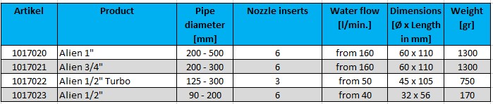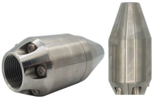Rotating steel pulling nozzle Alien for clogged pipelines and for cutting small roots. Due to the frontal steel rotation at an angle of 20°, the Alien nozzle breaks up stubborn blockages in pipelines.