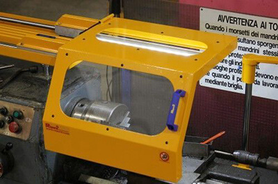 Safety Guard for lathes Minor made of steel sheet, sliding on ball guides. The upper and front side are provided with large windows of polycarbonate or optional glass, complete with microswitch system and fitting supports.